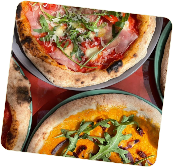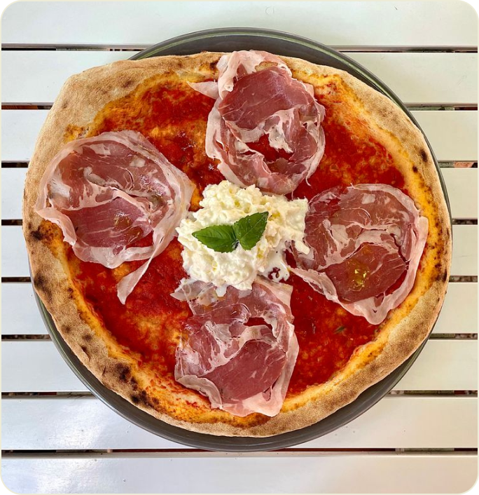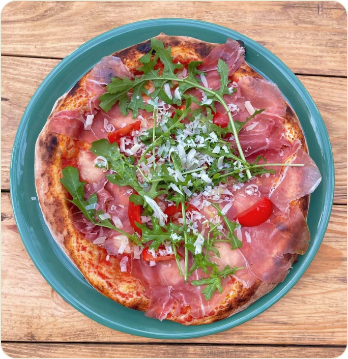 Italian Tomatoes, Mozzarella, Italian Prosciutto, Rucola, Cherry Tomatoes, Parmigiano Flakes, Extra Virgin Olive Oil
